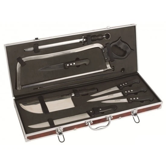 It includes 9 butcher knives and accessories of great quality
