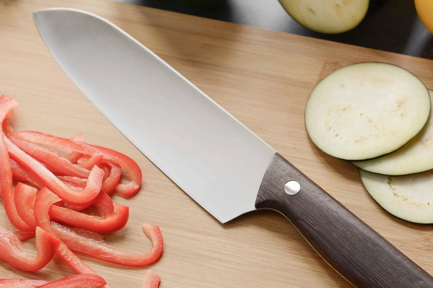 The handle of this knife is made of wood, and it is very comfortable to hold. Thanks to the unique veins on the wood, every knife from this range is different from others. Besides, the dark wood and the steel blade give a beautiful contrast that pleases cooks who care about the design of their knives. The handle is further fitted by a steel rivet to further secure the knife.Â