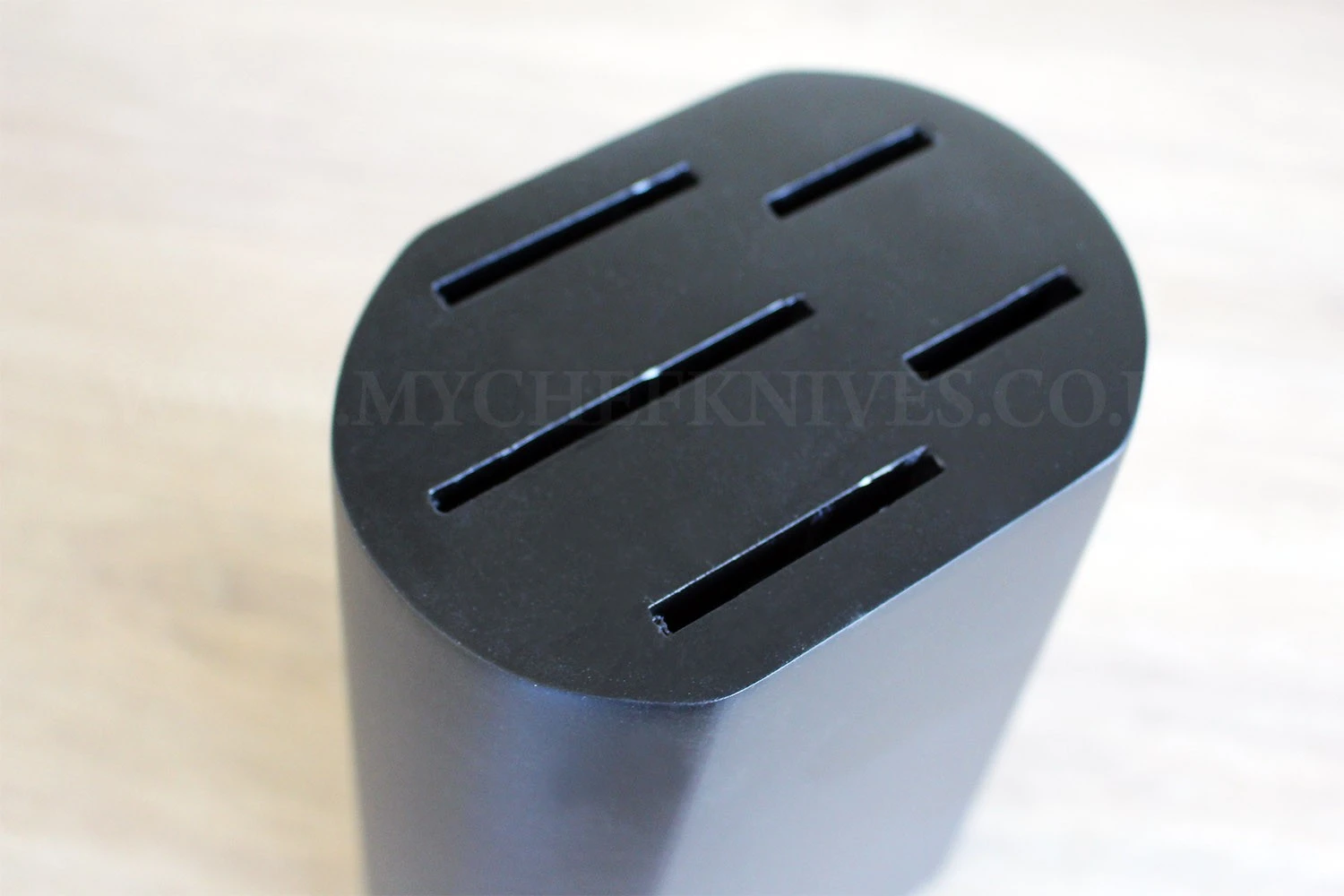 The knife block provides an individual slot for each of the 5 knives previously mentioned, so there is no risk of having their blades clashing against each other. Moreover, thanks to its compact size, it will not occupy too much space on your worktop. Last but not least, its simple but elegant design makes it the perfect decoration in any kitchen.