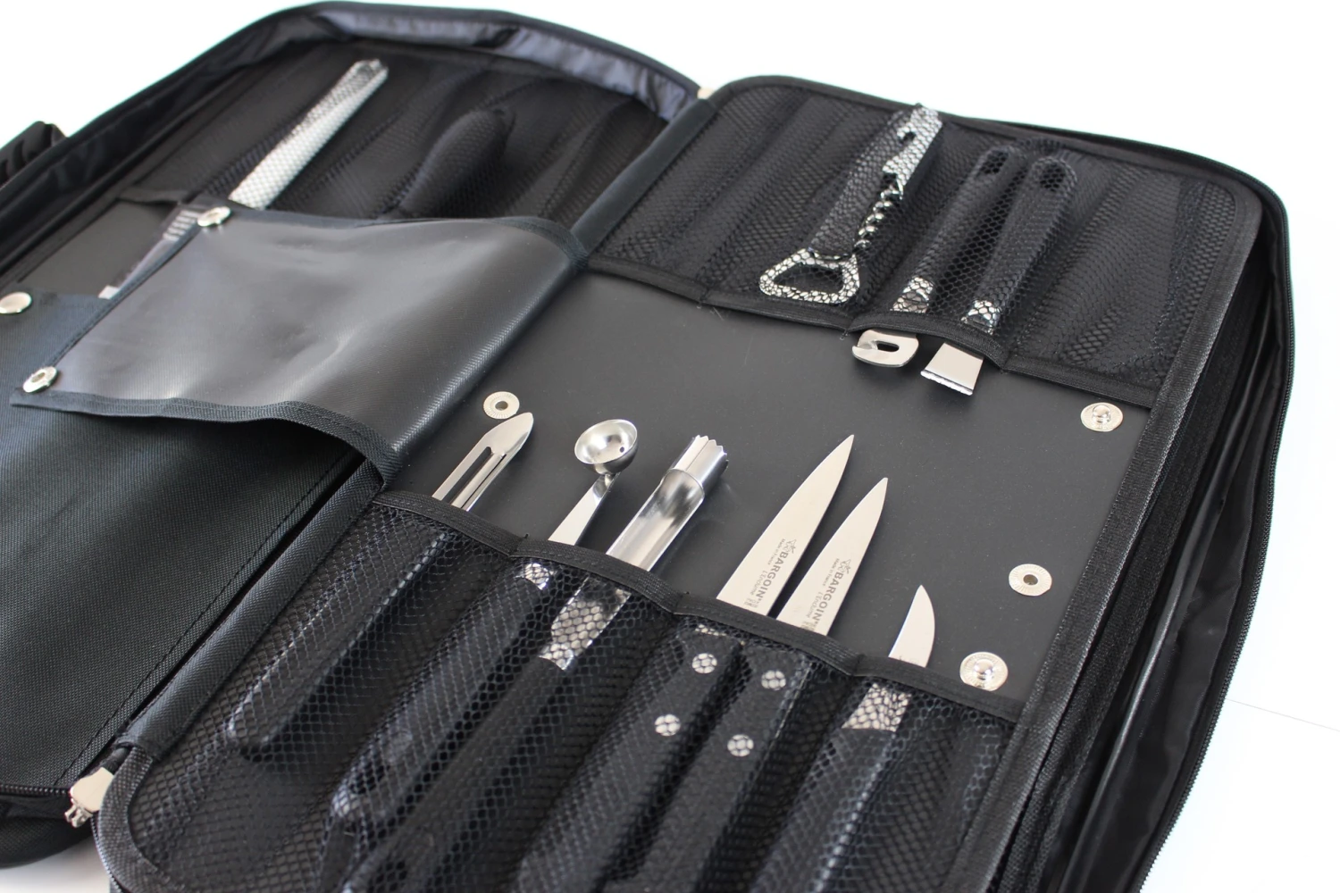 This professional knife bag is very flexible, and it can be carried with great ease thanks to its reinforced handle. When the bag is closed, it has the following dimensions: 48 x 28 cm. In addition, this bag is furnished with 20 different kitchen knives and accessories of great quality. The items included in this bag are listed below: