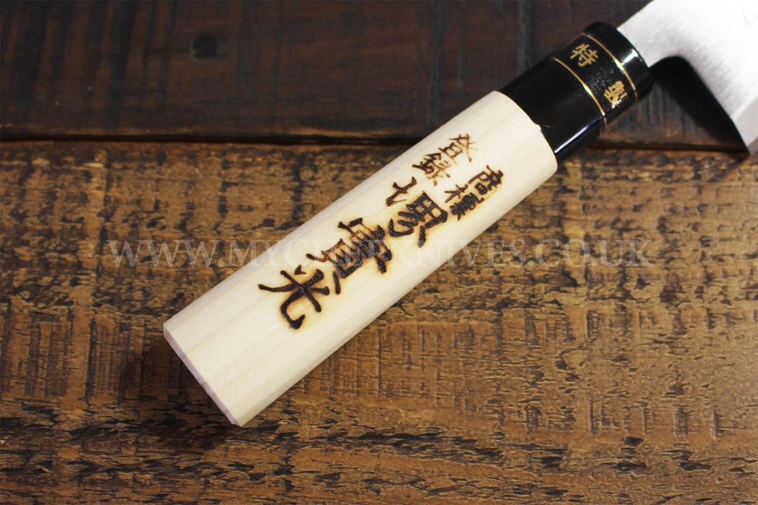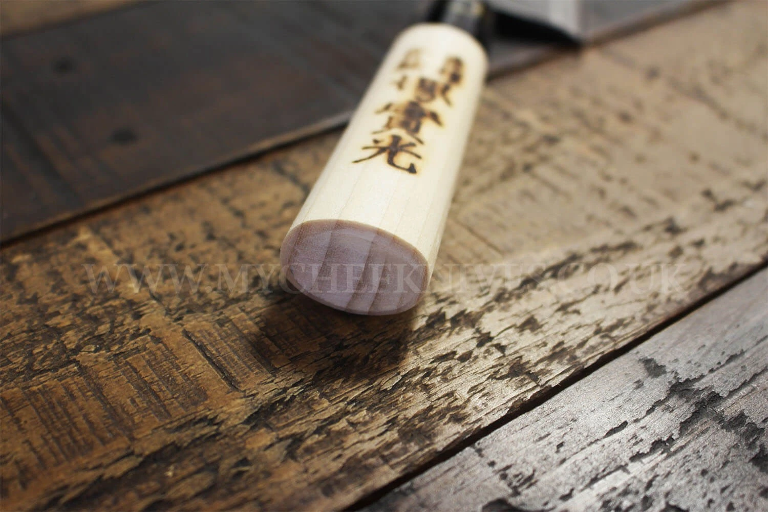 To enhance the aesthetics of the knife, the blade’s surface has been engraved by the artisan to show the brand’s logo in Japanese. The engraving is directly made by hand using a punch and a small hammer, and because it is truly engraved in the steel and not just stamped, the logo will never fade away. Details like this is what make this knife so special!