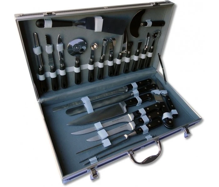 This 23-piece cook’s case is the perfect way to experience to experience the great quality of Pradel Excellence products. The case has an elegant design that makes it look like if it were a business briefcase. The dimensions of this knife case are 50 x 28 x 7 cm.