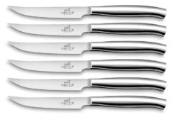 All the knives included in this set have blades that are made of X50CrMoV15 stainless steel. The combination of chromium, molybdenum, and vanadium present in the steel make the blade resistant to corrosion, and it ensures its great durability. These qualitites allow the knives to cut with great ease and effectiveness.