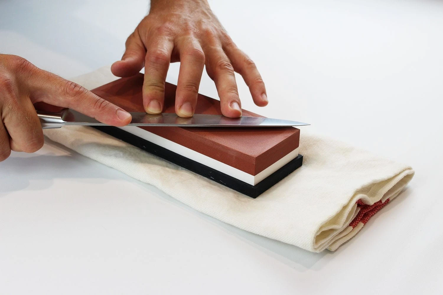 The whetstone comes with a black, non-slip base made of silicone in which you can put the stone to ensure stability whilst you sharpen your knives. For an optimal usage of this sharpening stone, we recommend you to soak it in water 15 minutes before usage, and during usage, do not hesitate to add some drops of water when the surface starts to dry.