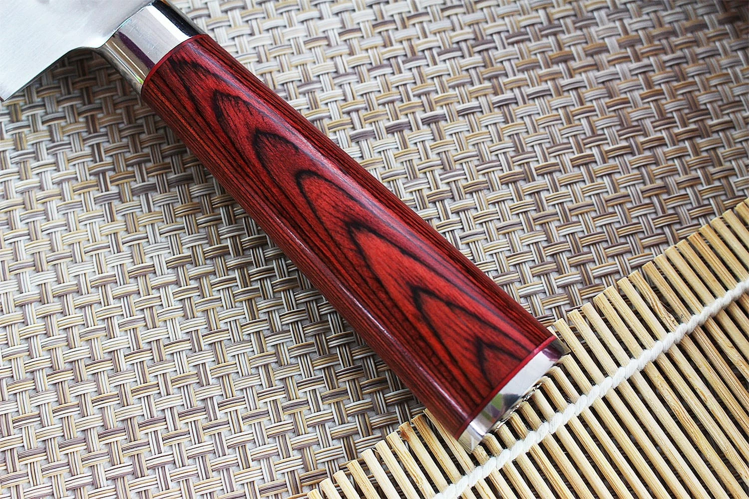 To complement the excellent blade, Wusaki have this knife a beautiful handle made of pakkawood. This composite material made of compressed resin and laminated wood has veinings on its surface, which give the knife an attractive look. This material is also known for its anti-bacterial properties and its resistance to the changes in temperature. The handle has also been varnished to add an extra layer of protection against humidity and stains.Â