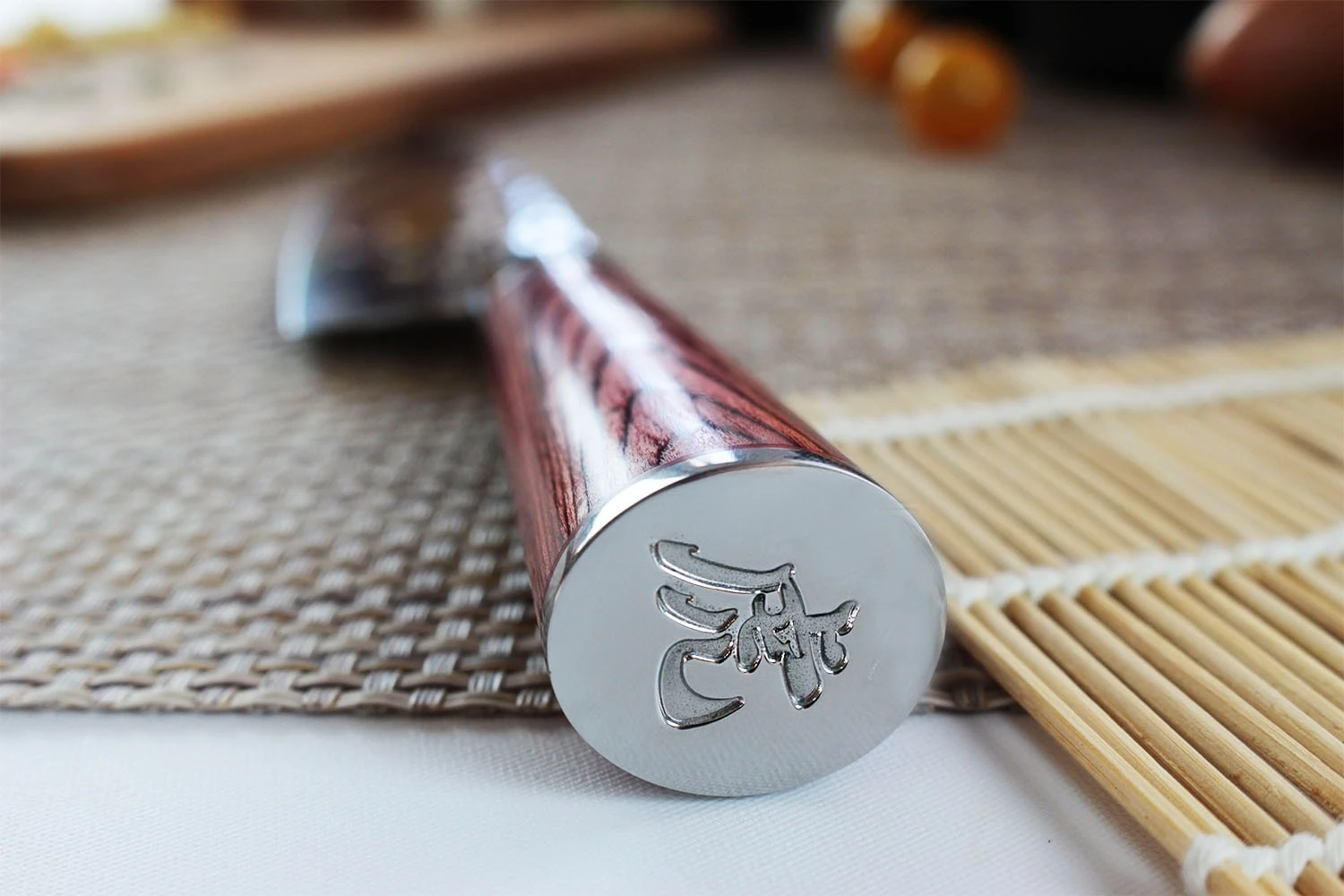 The reddish tone of the handle and the unique patterns on the blade create a beautiful contrast that embellishes the knife. The handle is suitable for both right-handed and left-handed cooks. All handles of Wusaki knives are a bit longer than standard knives to enable a more comfortable grip. At the base (bottom) of the handle, there is an engraving of the Japanese character “Tiger.”